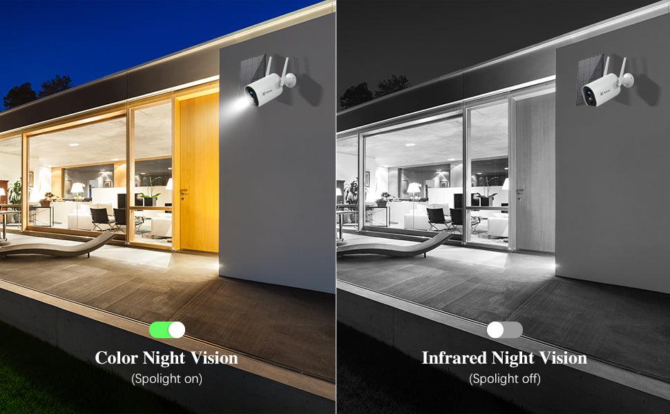 This soalre outdoor wifi camera has 3 night vision modes: IR, color, auto, Under color mode(spotlight is on), it presents brightly colored image even in total darkness conditions. According to the changes of the light during a day, IR-Cut mode automatically switches to night vision. The maximum night vision distance is 10 meters away.