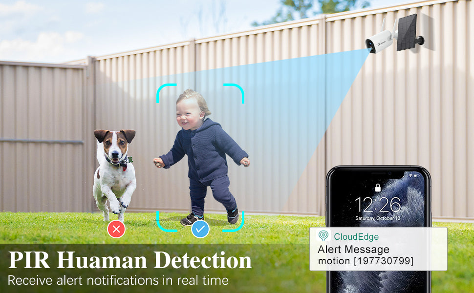 - PIR Human Detetcion - This wireless solar camera precisely detects human bodies under Human detection mode and also can detect pets and animals under PIR detection mode. When triggered, it sends alerts and app alarm notification instantly.