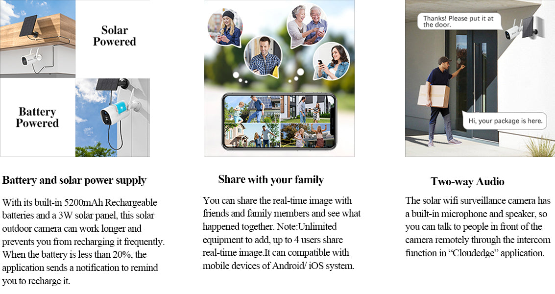 - Two ways to recharge - Get a constant power supply thanks to built-in 5200 mAH rechargeable Li batteries and 3W solar panel.When the battery is less than 20%, the application sends a notification to remind you to recharge it