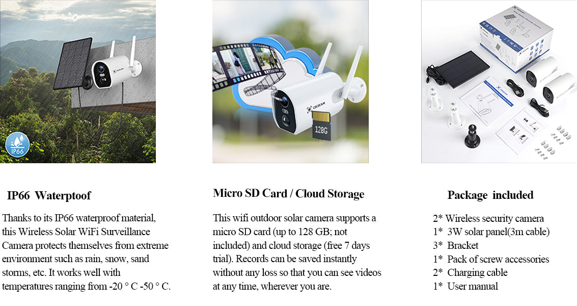 - 2 pcs security wifi camera + 1 pcs solar panel